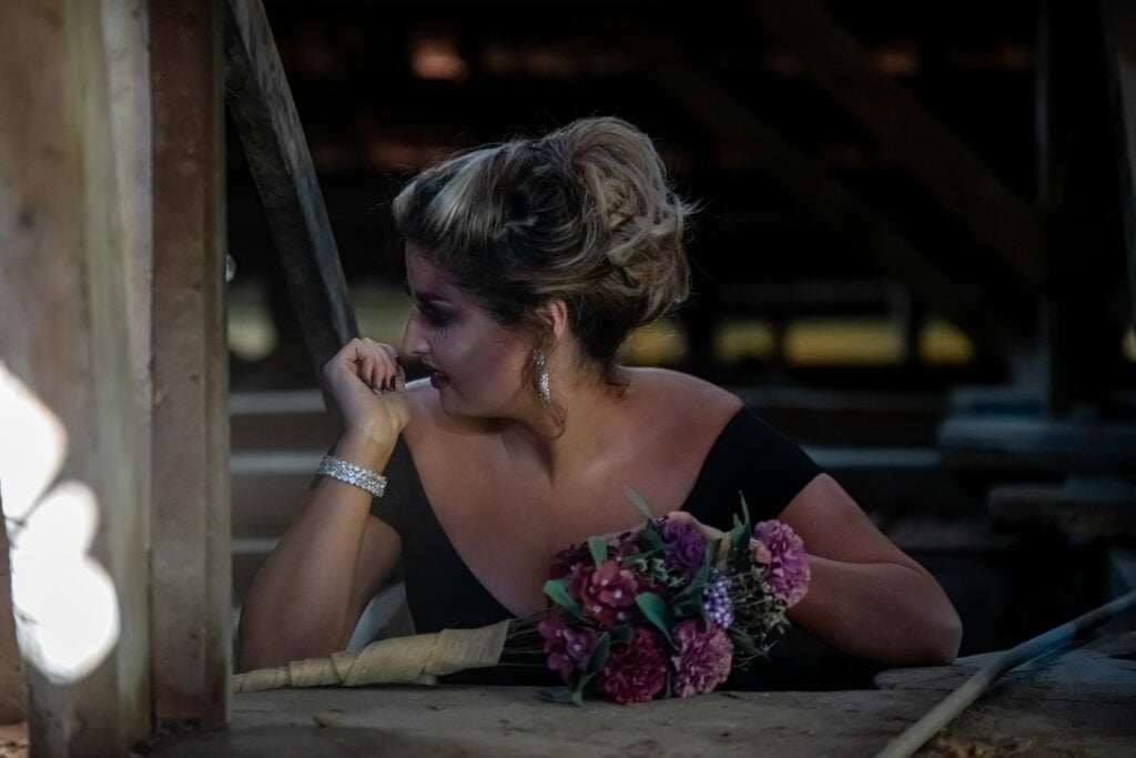 Elegant Halloween attire with a touch of black and spooky makeup, worn by a lady.